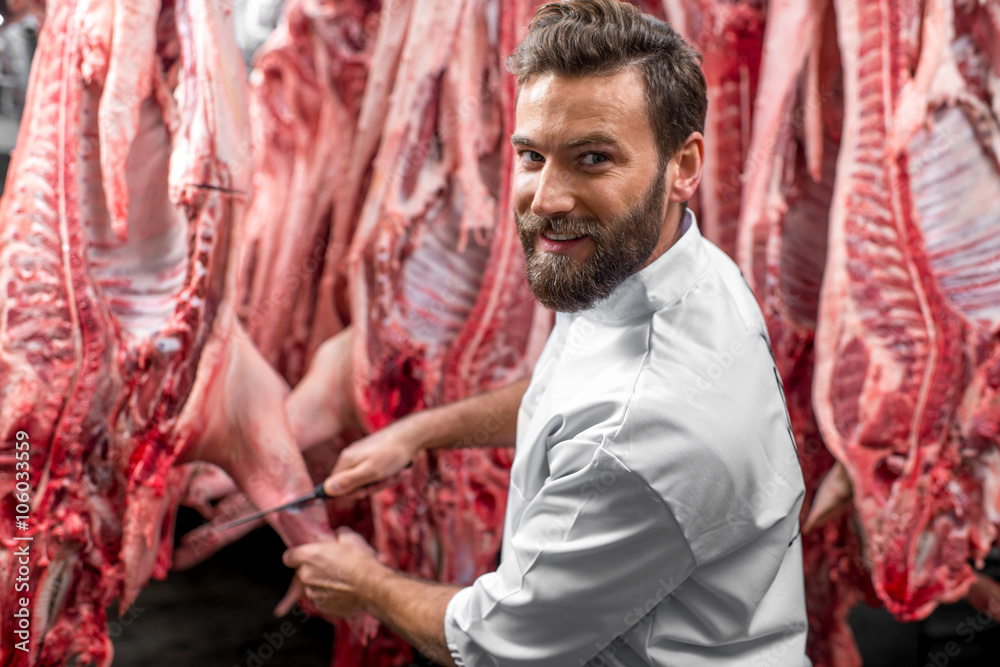 Handsome Butcher Cutting Pork Carcasse At The Meat Manufacturing Stock Foto Adobe Stock